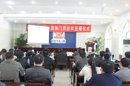 3月27日上午10時(shí),四特酒2012年部門責(zé)任狀簽署儀式在公司含弘樓9樓多功能會(huì)議廳舉行。廖昶董事長(zhǎng)與各副總出席簽署儀式,共同見(jiàn)證了24位部門負(fù)責(zé)人簽署部門2012年度目標(biāo)責(zé)任狀。